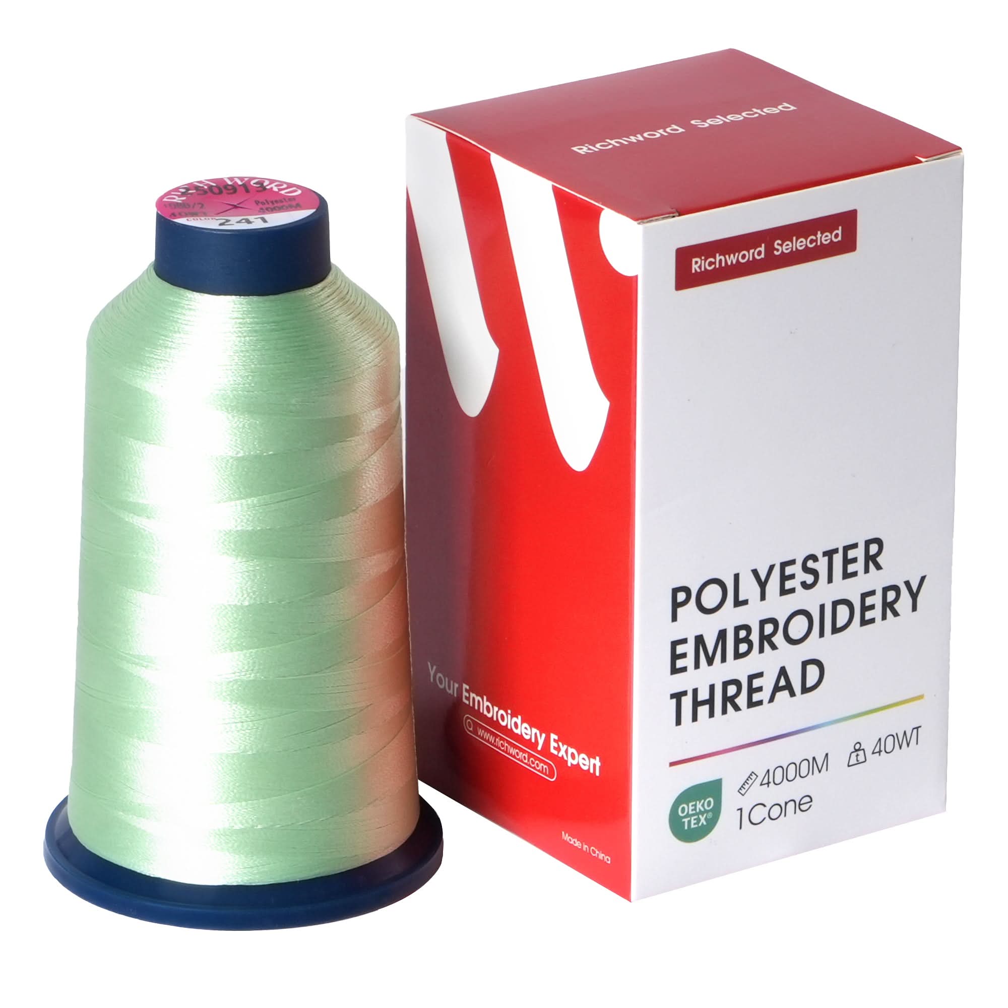 Richword selects 100 colors of polyester thread to meet any of your embroidery needs. Each spool is 40 W.T. (108D/2) thick and 4000M (4374Y) long. Our threads are made of high-quality polyester material, with high gloss and bright colors. And they have the advantages of wear resistance and washability. These make the threads very suitable for all embroidery machines, including household, semi industrial, industrial, and commercial embroidery machines.