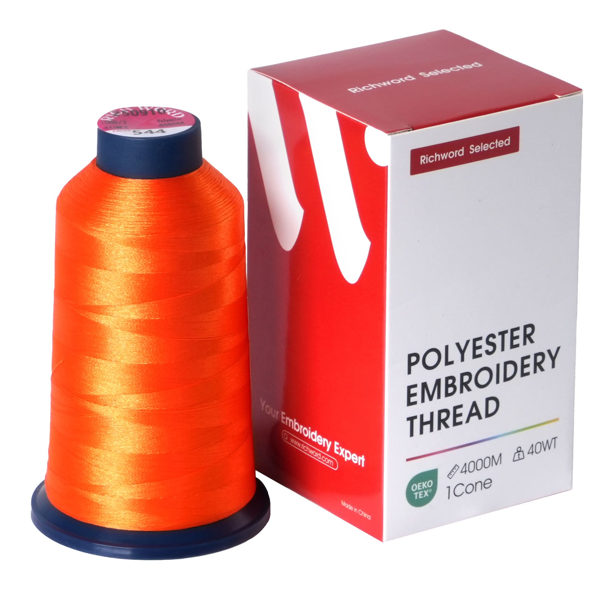 Richword selects 100 colors of polyester thread to meet any of your embroidery needs. Each spool is 40 W.T. (108D/2) thick and 4000M (4374Y) long. Our threads are made of high-quality polyester material, with high gloss and bright colors. And they have the advantages of wear resistance and washability. These make the threads very suitable for all embroidery machines, including household, semi industrial, industrial, and commercial embroidery machines.
