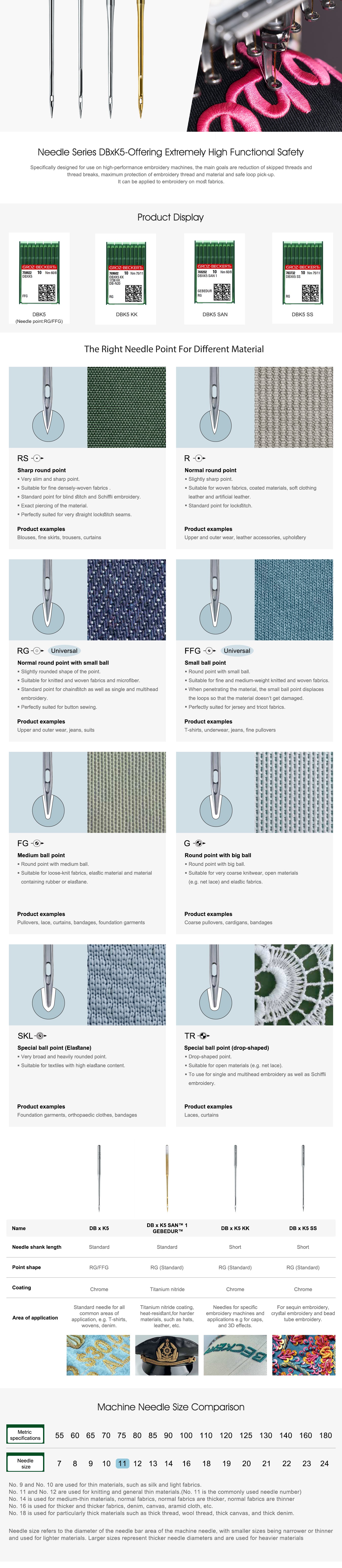 All needles in the system have the same length and shank size, but different diameters. Small numbers are for narrower or thinner needles for lighter materials. Higher numbers indicate thicker diameter needles for use with heavier materials.This is a very common needle system compatible with many Industrial embroidery machines including Barudan, Brother, SWF, Tajima, feiya, feiyue and many other industrial embroidery machines.