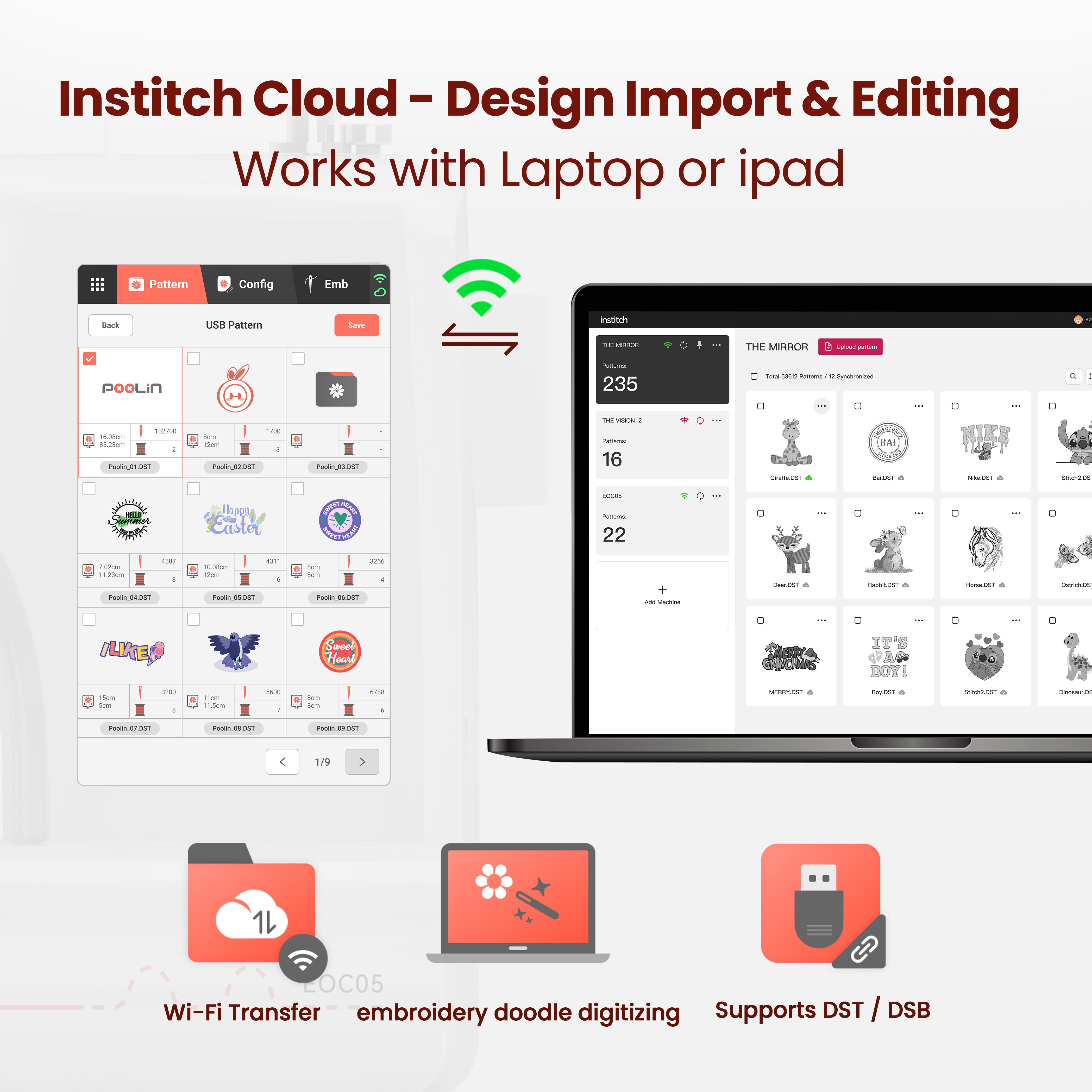 - USB port: Convert to DST/DSB format and import patterns of your own design