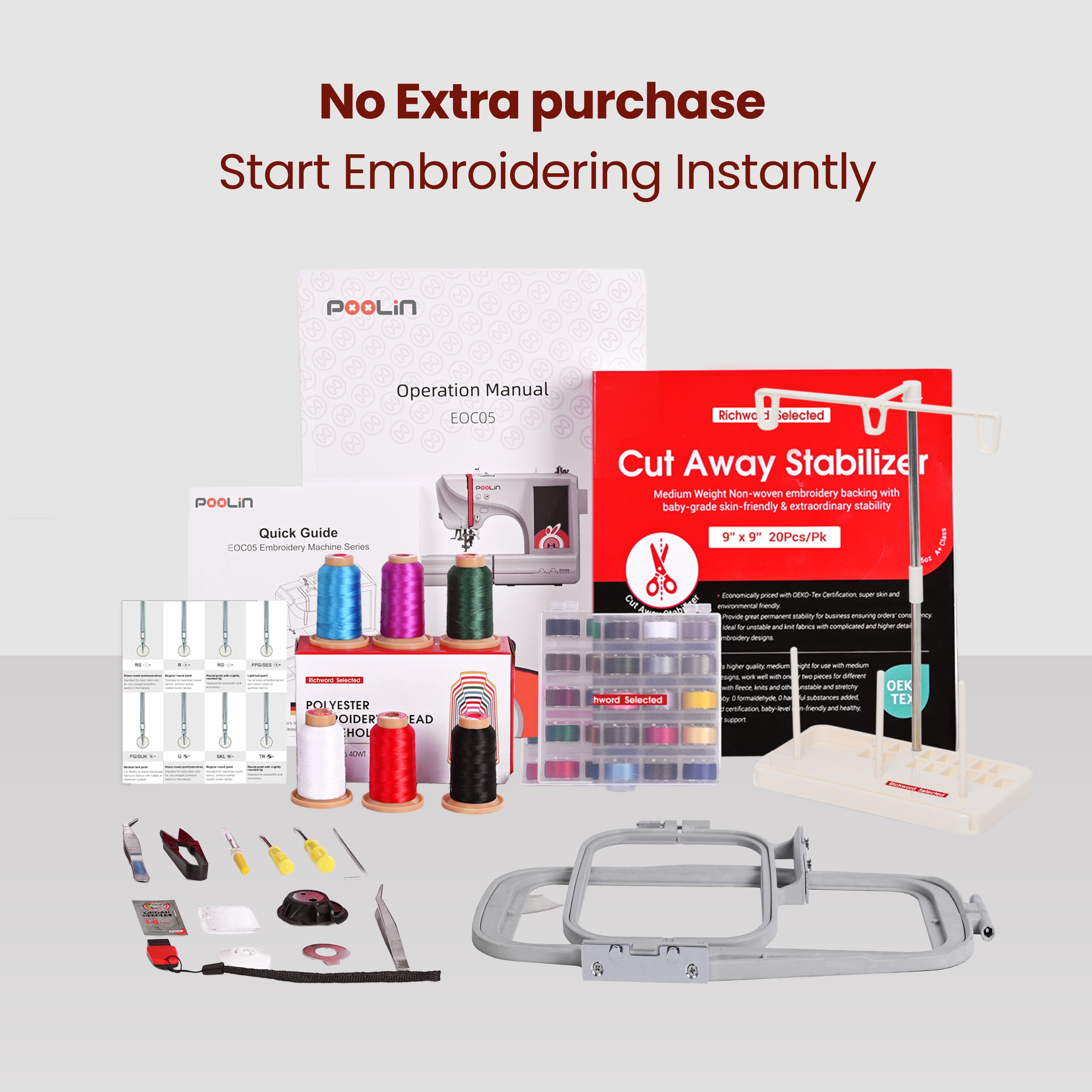 We have considered all the consumables you need for embroidery, including two hoops, embroidery thread, stabilizer , bobbins, scissors and other tools.