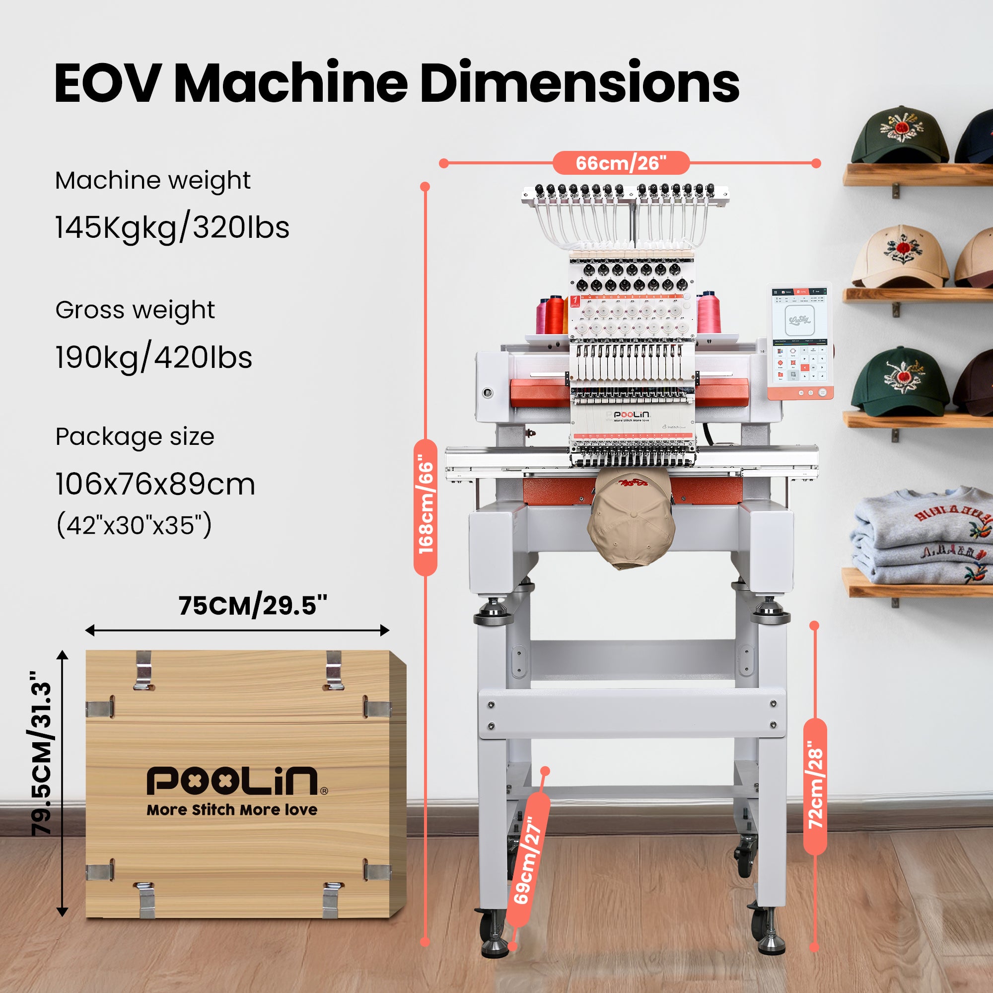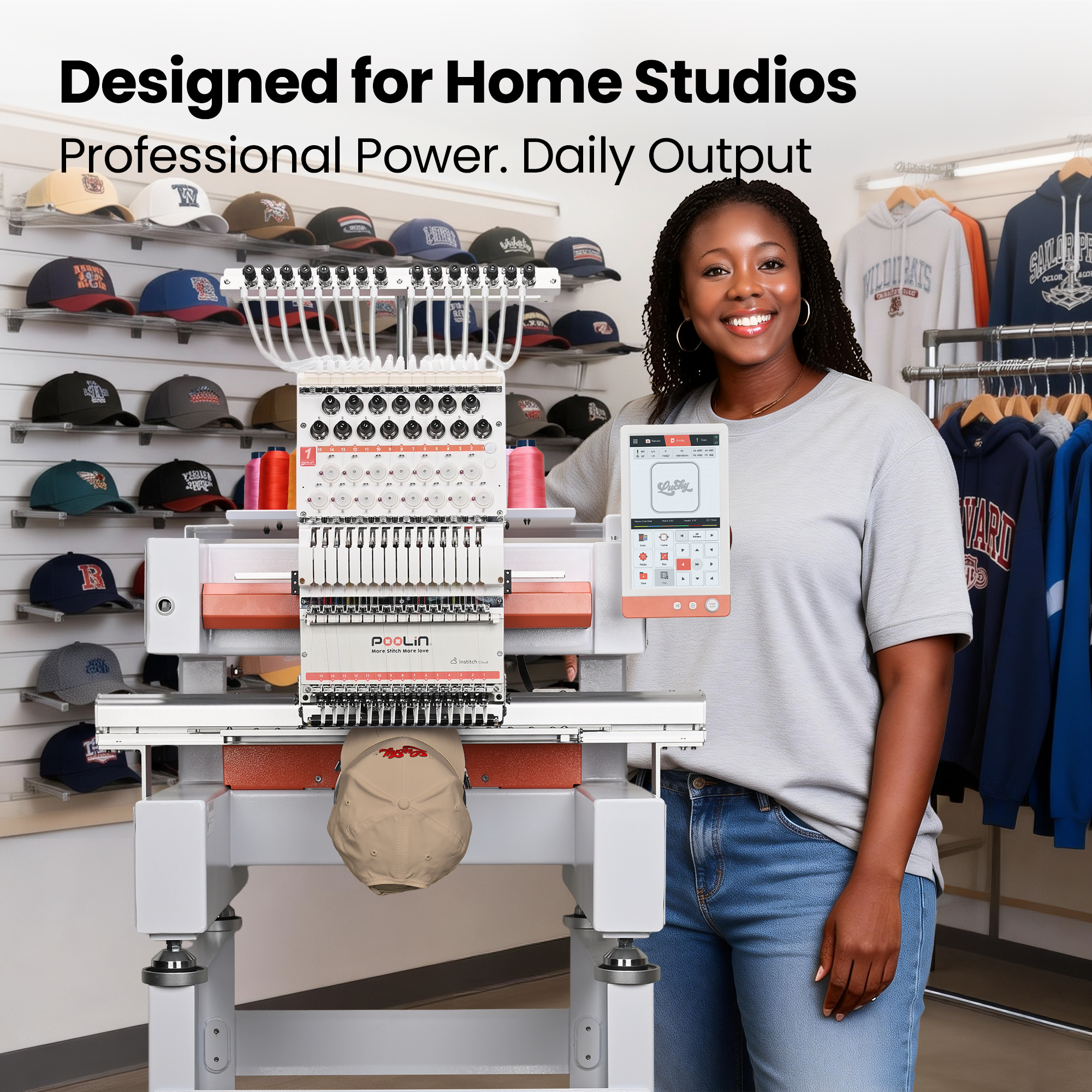 POOLIN EOV 15 Needle Cap Embroidery Machine Vison, Compact Multi-Needle for Small Business & Home Shop, Cap & Flat Embroidery, InStitch Software, WiFi Transfer, Built for Daily Production