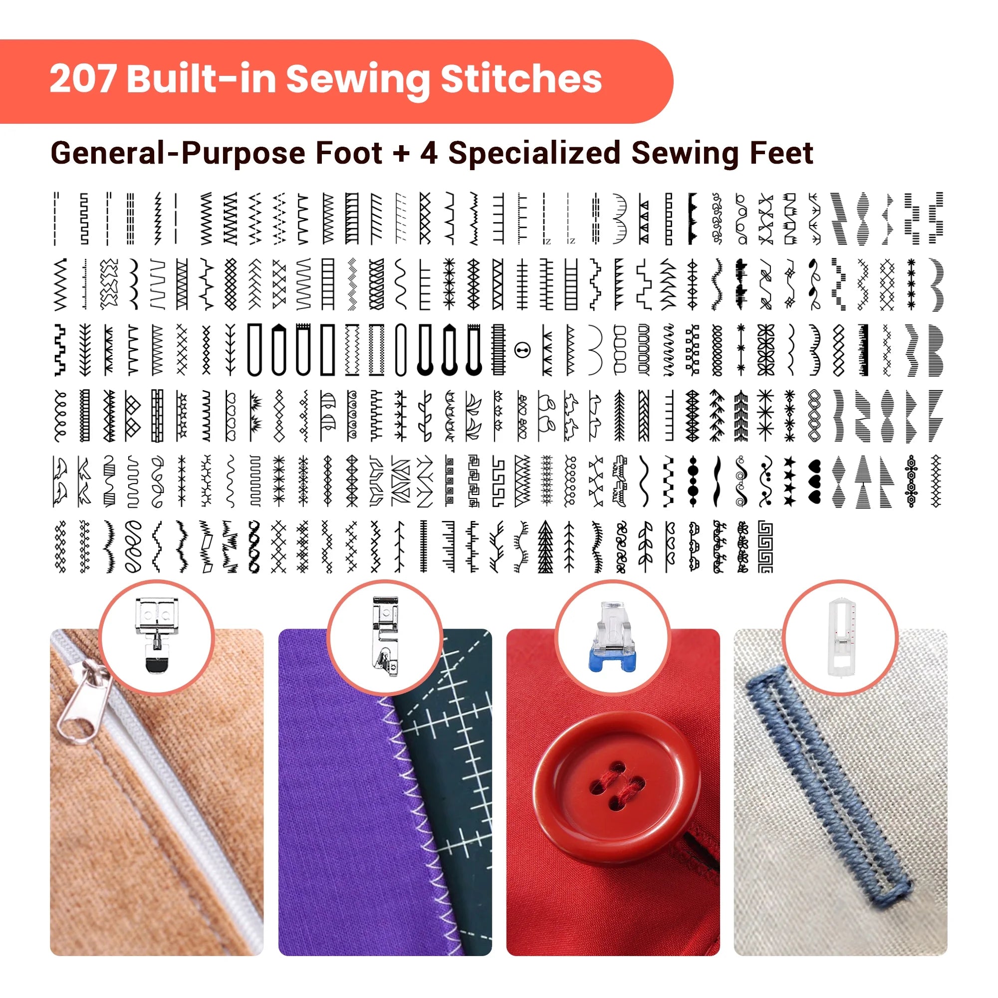 2. 207 stitches available with 6 pressor feet.