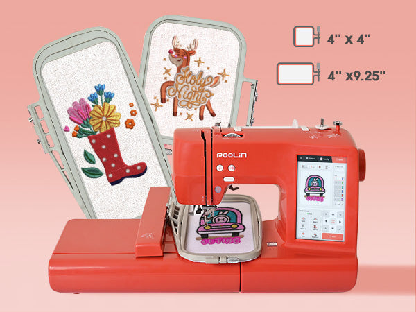 The POOLIN EOC05RE embroidery machine comes equipped with two different embroidery hoop sizes, a standard 4" x 4" and a larger 4" x 9.25". This variety in hoop sizes offers users flexibility and choice, allowing the machine to cater to a range of embroidery project dimensions.