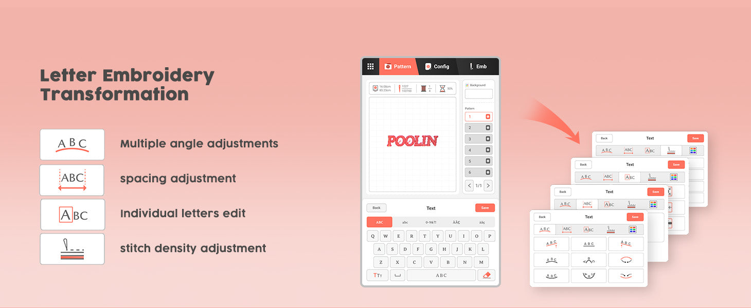 Letter EmbroideryTransformation | Multiple | angle adjustments | spacing adjustment | Individual letters edit | stitch density adjustment