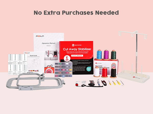 We have considered all the consumables you need for embroidery, including two hoops, embroidery thread, stabilizer , bobbins, scissors and other tools.